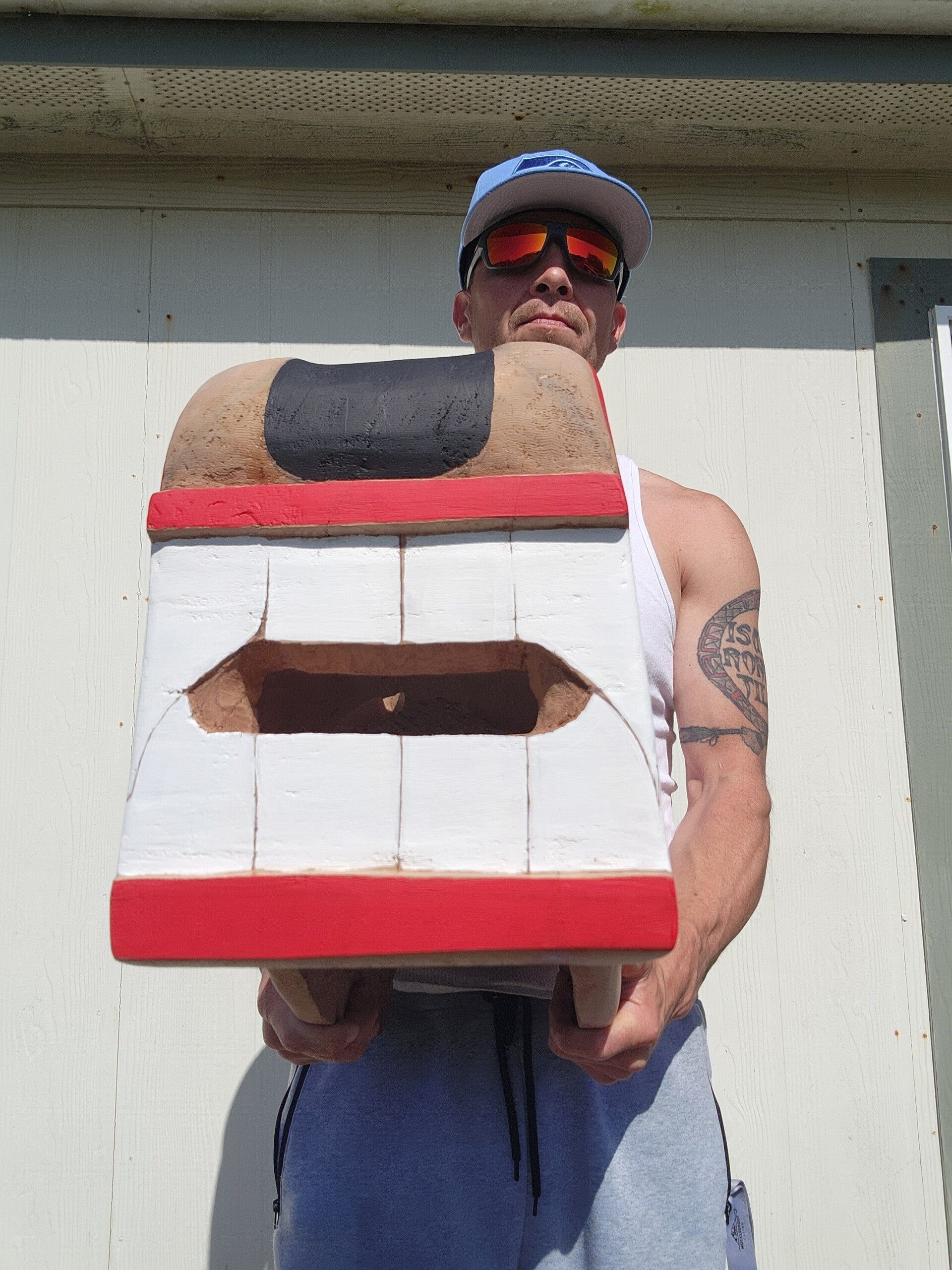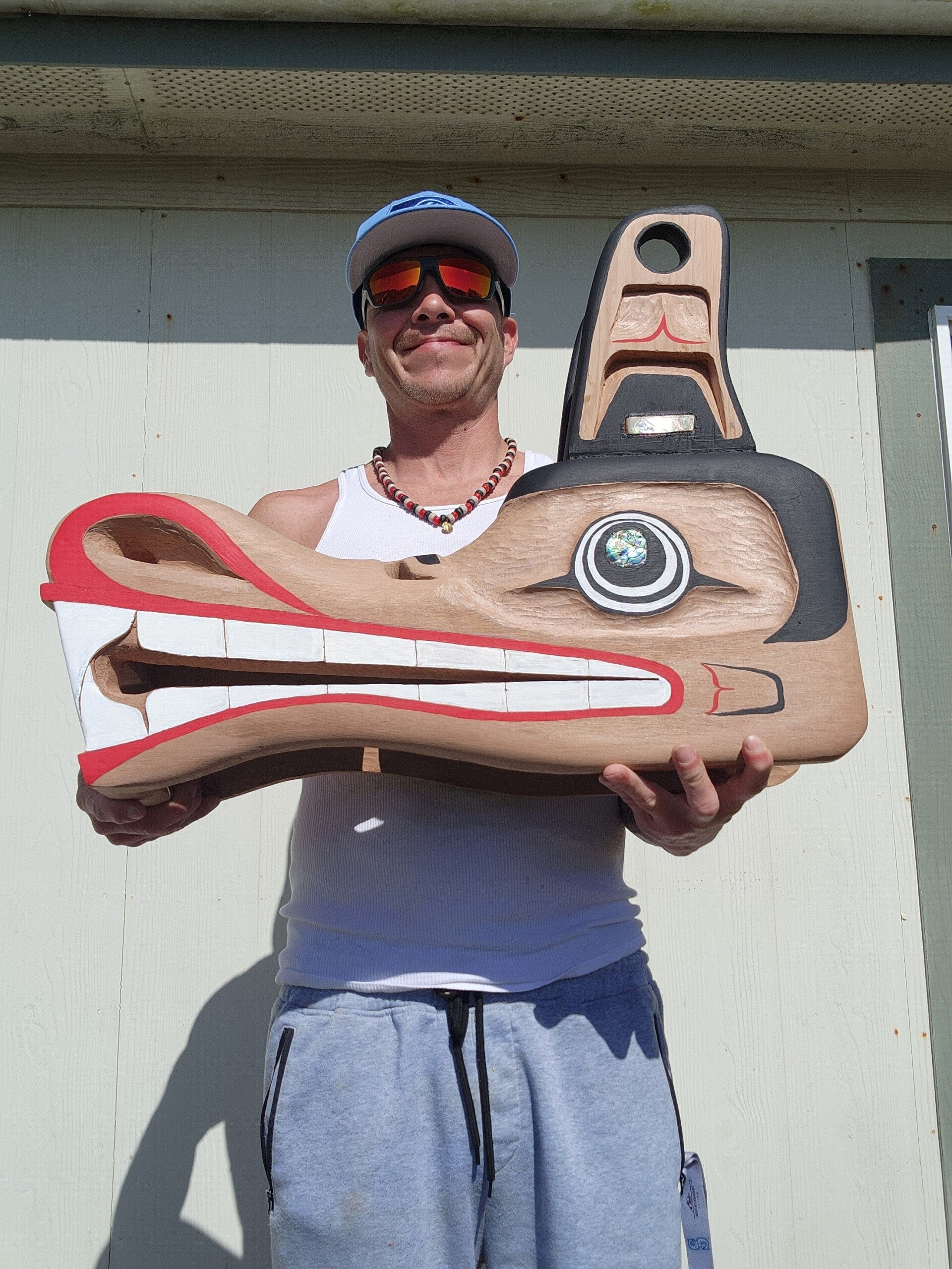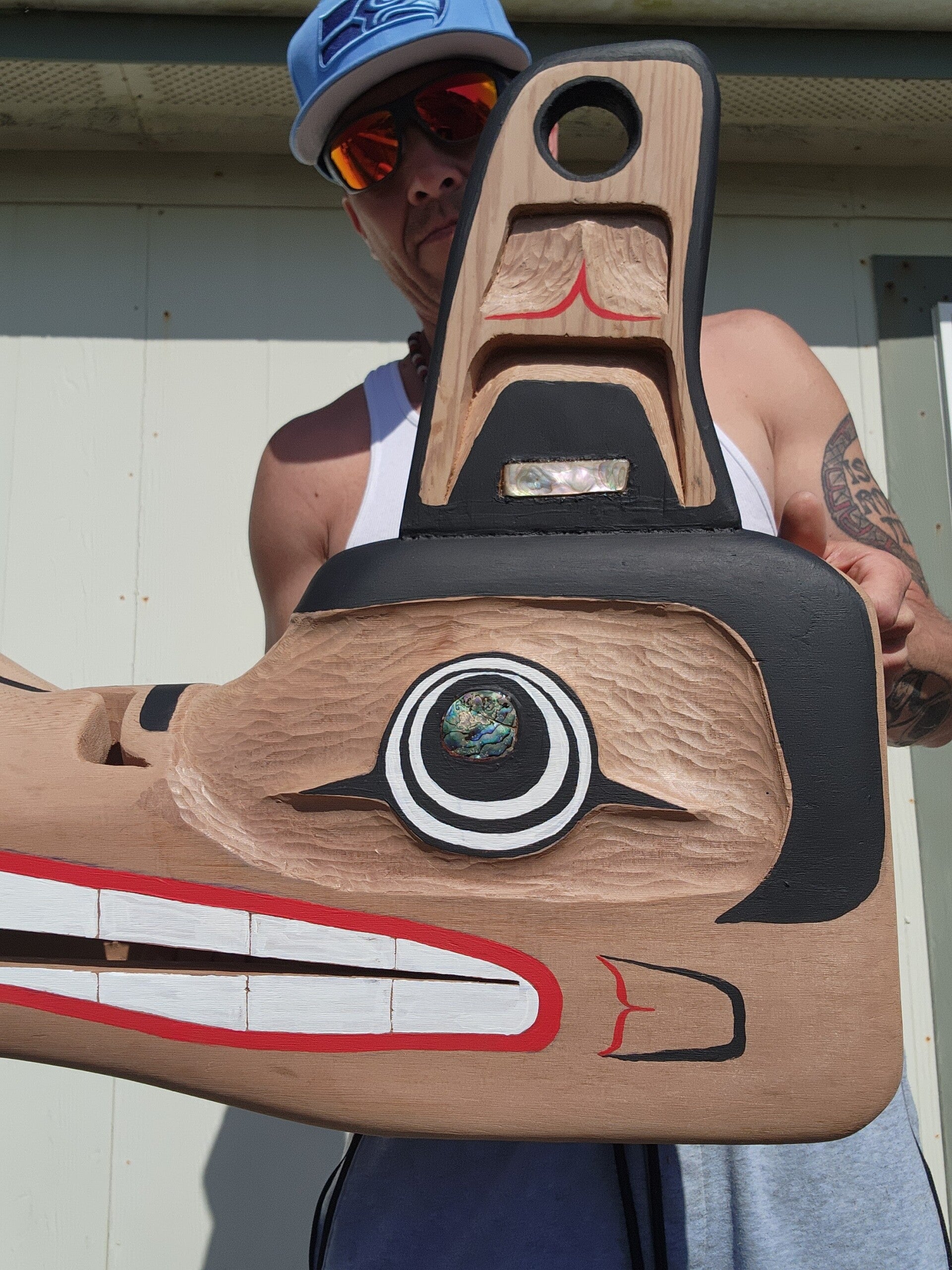 2 foot x 2.5 foot cedar wolf mask. Acrylic paint and abalone eyes.